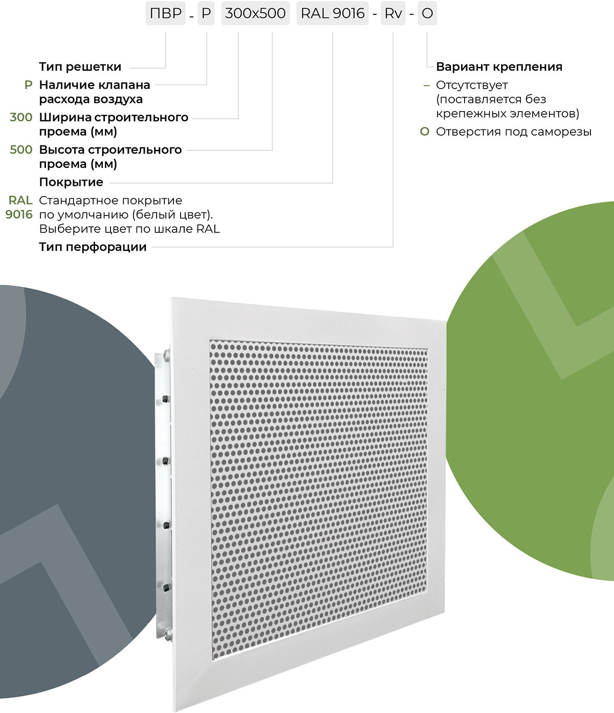 Перфорированные решетки с клапаном расхода воздуха ПВР-Р используются в приточно-вытяжной вентиляции, различных системах воздуховодов, кондиционирования воздуха и предназначены для монтажа в воздуховоды или строительные проемы в помещениях различного типа и назначения. Решетки ПВР-Р изготовлены из алюминиевого профиля в виде рамки и перфорированной вставки из оцинкованной стали. По умолчанию решетка имеет круглую перфорацию со смещенными рядами отверстий RV 5-7, но по желанию заказчика возможно изготовление решетки с любой перфорацией. От размера отверстий и расстояния между ними зависит коэффициент живого сечения, что влияет на аэродинамические характеристики изделия.