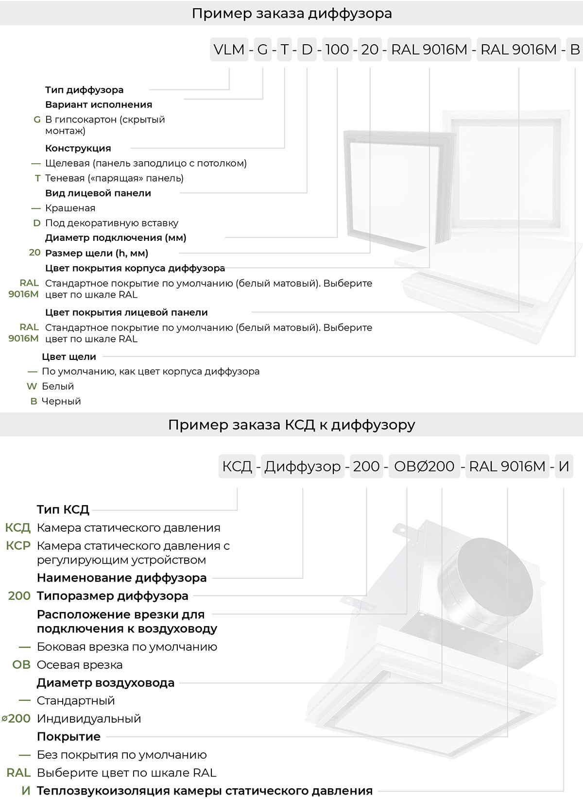 Рамка диффузора VLM-G изготавливается из экструдированного алюминиевого профиля АД31 по ГОСТ 22233-2018. Лицевая панель - из оцинкованной стали 0,9 мм. По умолчанию корпус диффузора и лицевая панель окрашиваются в белый цвет RAL 9016М матовый. По индивидуальному заказу возможна окраска в любой цвет по шкале RAL. КСД изготавливается из оцинкованной листовой стали 0,4 - 1,5 мм в зависимости от размера и пожелания заказчика. По умолчанию КСД поставляется в неокрашенном виде.
